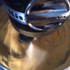 – Mettre le sucre glace, la poudre d’amande et les 85g de beurre pommade.Des que le mélange est bien homogène versé les 85g d’œuf battus en omelette puis à la fin la farine de riz