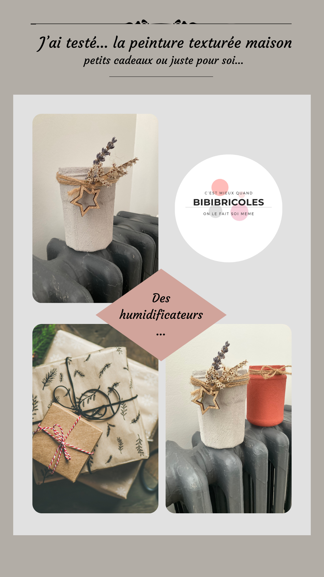 Temps gris, quelques heures à tuer… il n’en fallait pas plus pour que je prenne le temps de tester la peinture « texturée » effet chaux ou béton je ne saurais trop dire 😬. Cela fait un certains temps que je souhaitais tester ce diy restait à savoir pour quoi faire… Le chauffage a redémarré ce matin !! Youpi !! J’ai trouvé.. des humidificateurs !! Ce sera nettement mieux que des pots de confiture sur nos superbes chauffages en fonte ! 🤗 (suite…)